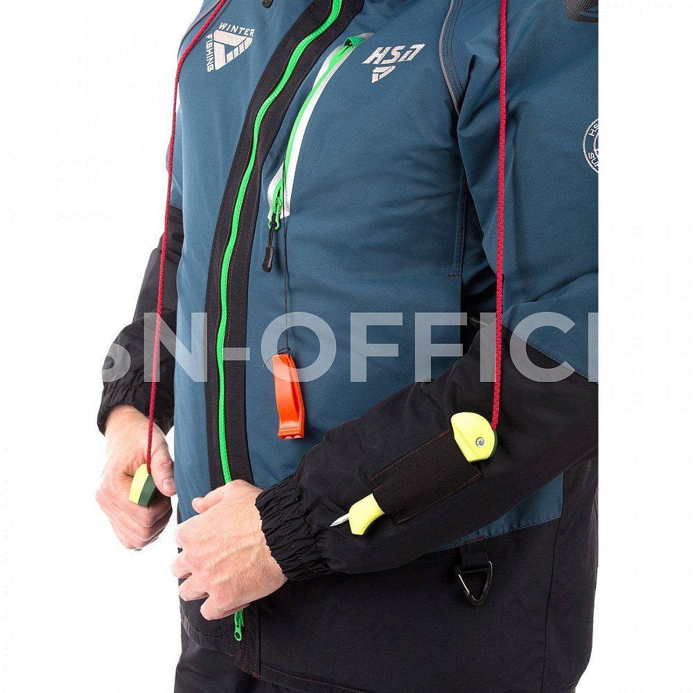 Куртка оснащена высоким воротником для защиты от ветра и глубоким капюшоном с жестким ветрозащитным козырьком. Утепленные карманы на куртке предназначены для размещения необходимого снаряжения и согрева рук. Специальные крепления для спасалок (идут в комплекте) и перфорация ткани на спинке и рукавах облегчают выход из воды при случайном падении.